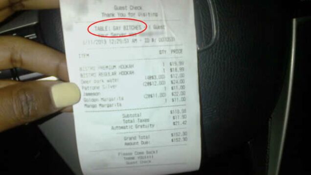 Amira Gray and eight friends were at Bistro 18 in Adams Morgan in August 2013, and when they received their check, they noticed that under the "customer name" section had been typed the words "gay bitches." They were understandably displeased with this, and brought it to the manager's attention. What happened next is in some dispute, although the bartender was definitely immediately fired and the check was fully comped. Almost a year later, Gray is now filing a discrimination complaint against Bistro 18 with the help of Lambda Legal.